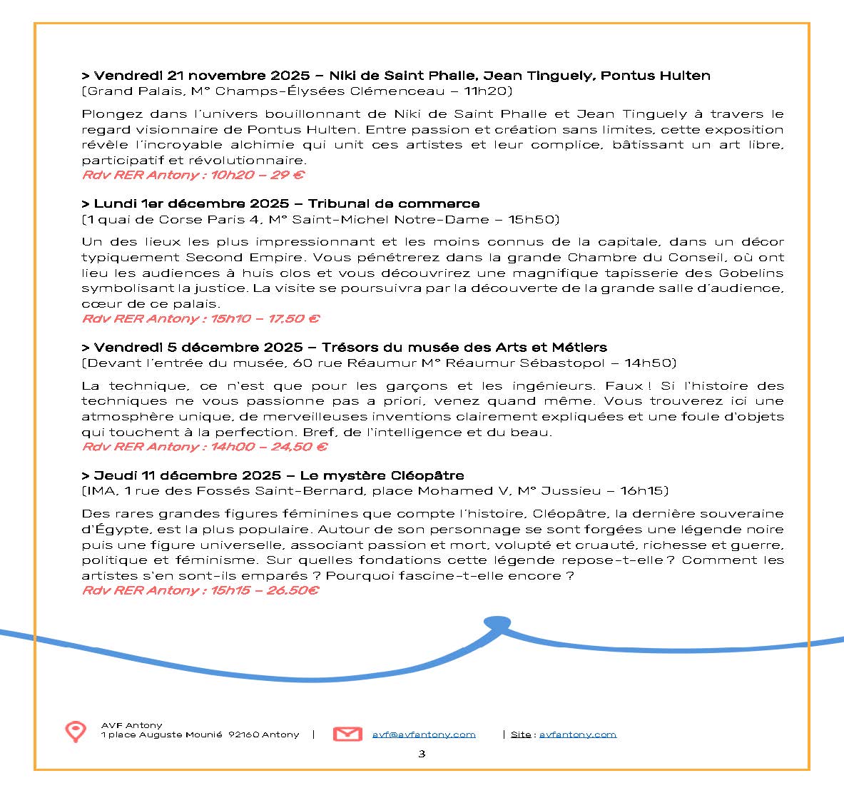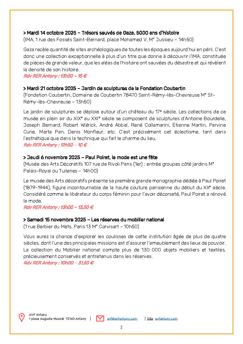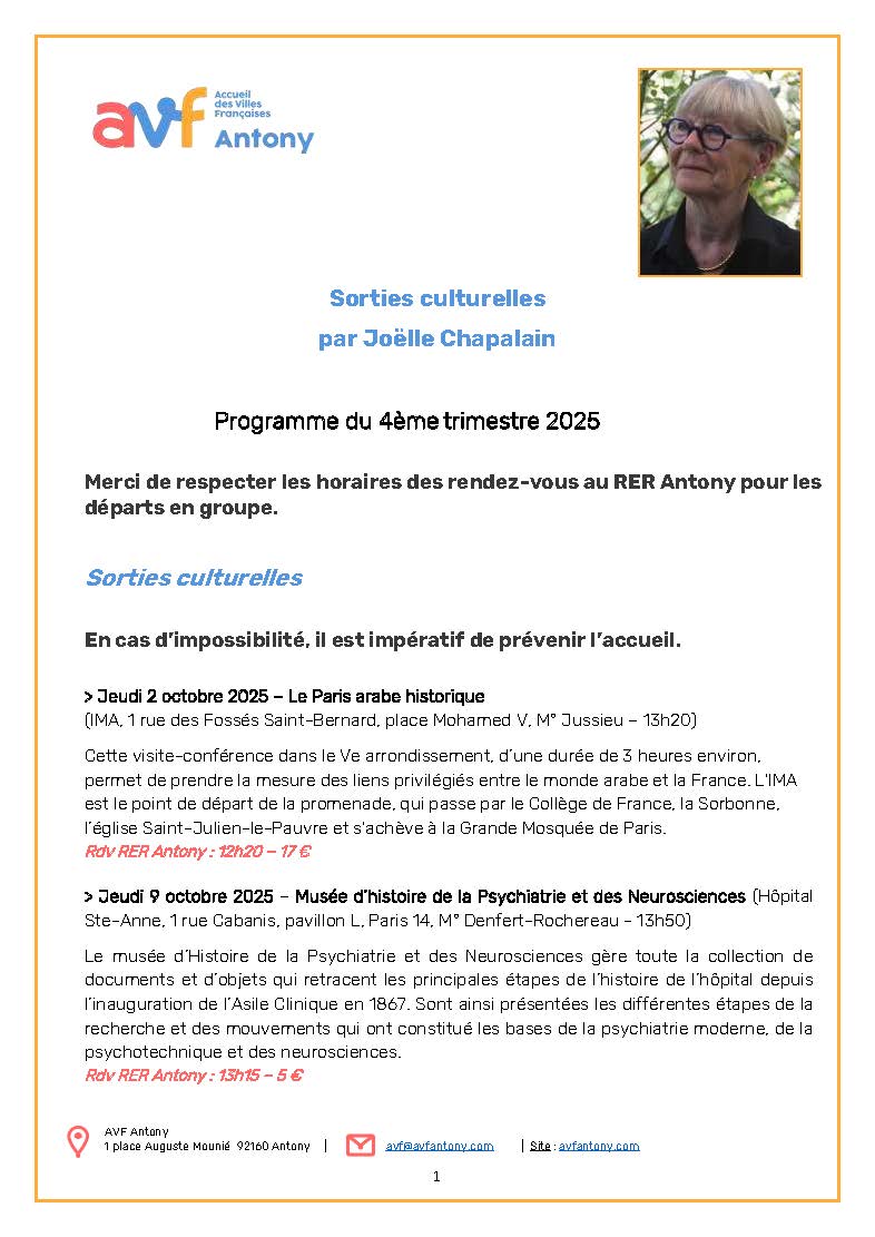 CLIQUEZ ICI Notre association fête son anniversaire : 40 ans CLIQUEZ ICI Pour les inscriptions aux sorties et à la dictée : CLIQUEZ ICI Les activités du réseau AVF : L'URAVF IDF et L'UNAVF |